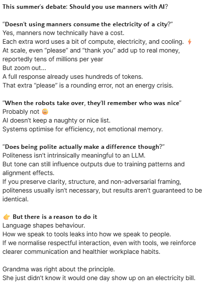 Growing up, I was told: โManners donโt cost anything.โ ๐ง๐ต๐ถ๐ ๐๐๐บ๐บ๐ฒ๐ฟโ๐ ๐ฑ๐ฒ๐ฏ๐ฎ๐๐ฒ: ๐ฆ๐ต๐ผ๐๐น๐ฑ ๐๐ผ๐ ๐๐๐ฒ ๐บ๐ฎ๐ป๐ป๐ฒ๐ฟ๐ ๐๐ถ๐๐ต ๐๐? โ๐๐ผ๐ฒ๐๐ปโ๐ ๐๐๐ถ๐ป๐ด ๐บ๐ฎ๐ป๐ป๐ฒ๐ฟ๐ ๐ฐ๐ผ๐ป๐๐๐บ๐ฒ ๐๐ต๐ฒ ๐ฒ๐น๐ฒ๐ฐ๐๐ฟ๐ถ๐ฐ๐ถ๐๐ ๐ผ๐ณ ๐ฎ ๐ฐ๐ถ๐๐?โ