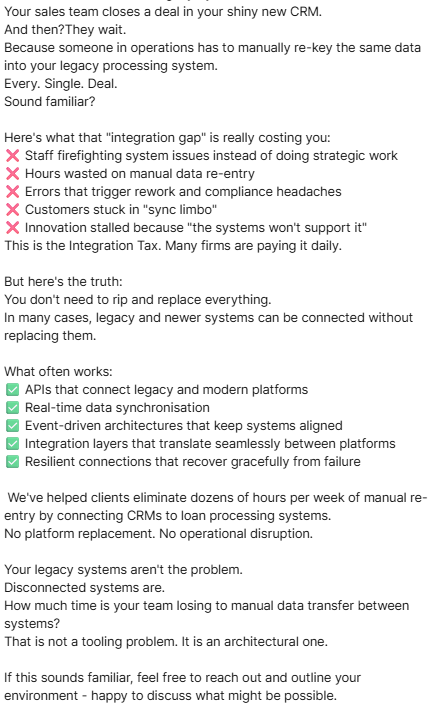 Your sales team closes a deal in your shiny new CRM. And then? They wait. Because someone in operations has to manually re-key the same data into your legacy processing system.