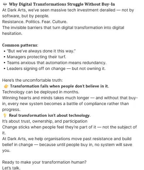 At Dark Arts, weโve seen massive tech investment derailed โ not by software, but by people. Resistance. Politics. Fear. Culture.